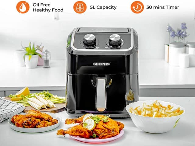Découvrez l’Air Fryer Geepas 5L Noir – GAF37528, la solution idéale pour une cuisson rapide, saine et savoureuse ! Grâce à sa technologie de friture à air chaud, préparez des frites croustillantes, des légumes rôtis, du poulet doré et même des desserts légers, sans une goutte d’huile.