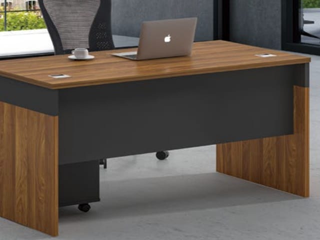 Son piètement cadre sculpté en biseau apporte une touche de modernité et de finesse, renforçant l’esthétique haut de gamme du bureau. La crédence intégrée ajoute une surface supplémentaire, idéale pour installer une imprimante, des classeurs ou des objets décoratifs.