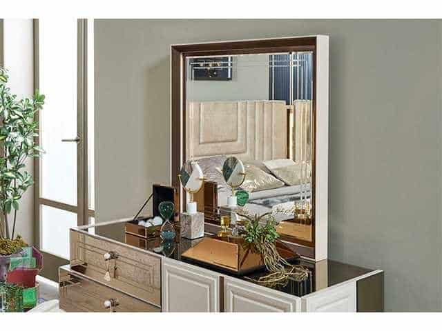 Le lit 180×200 offre un couchage spacieux et confortable, tandis que l’ensemble des meubles assortis permet une organisation optimale de votre espace. L’armoire à portes battantes offre un volume de rangement généreux, et les meubles complémentaires — chevet, coiffeuse avec miroir et pouf — viennent apporter praticité et élégance à votre quotidien.