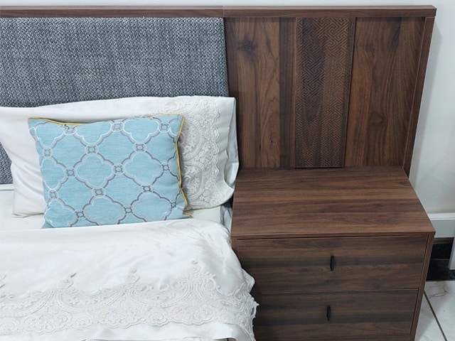 Les tables de chevet (550 × 400 × 520 mm) complètent harmonieusement le lit et offrent des espaces pratiques pour garder vos objets essentiels à portée de main. La commode avec miroir (1200 × 400 × 800 mm) constitue un atout supplémentaire pour optimiser votre rangement tout en apportant une touche de modernité. Le meuble de rangement supplémentaire (920 × 400 × 1050 mm) apporte encore plus de fonctionnalité, idéal pour structurer votre chambre avec style.