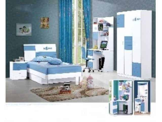 Cet ensemble proposé sous la référence 845, est une chambre à coucher complète pour enfant, avec un couchage de 120 × 190 cm, dans une combinaison de couleurs bleu et blanc. Il s’agit d’un mobilier coordonné conçu pour aménager une chambre d’enfant ou pré-ado avec style et fonctionnalité.