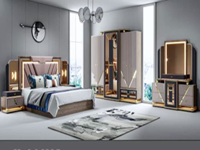La chambre à coucher Réf. 693 est conçue pour créer un espace nuit harmonieux et fonctionnel. Son association de couleurs beige, marron et doré, ainsi que ses dimensions 2400 × 600 × 2300 mm, permettent un aménagement structuré et adapté aux chambres modernes.