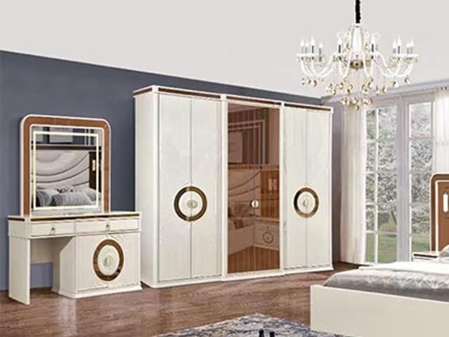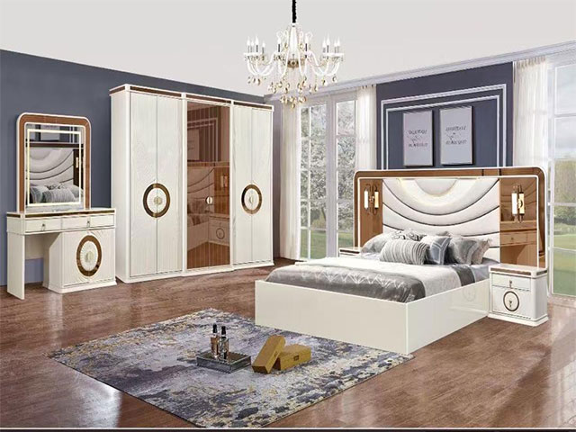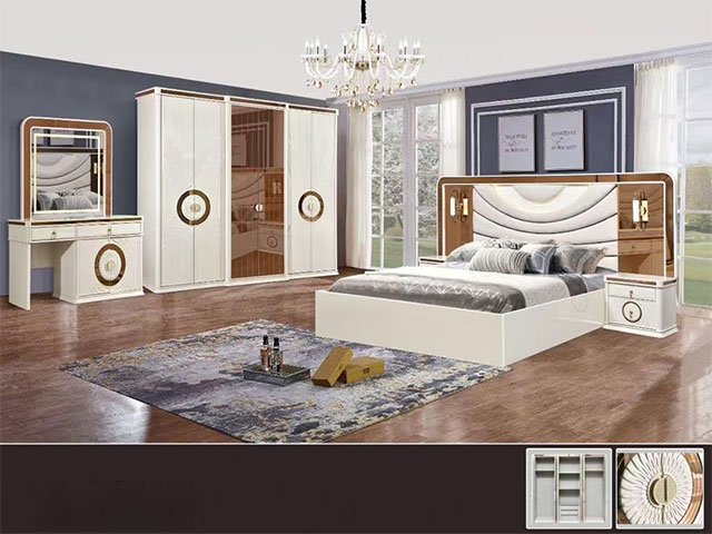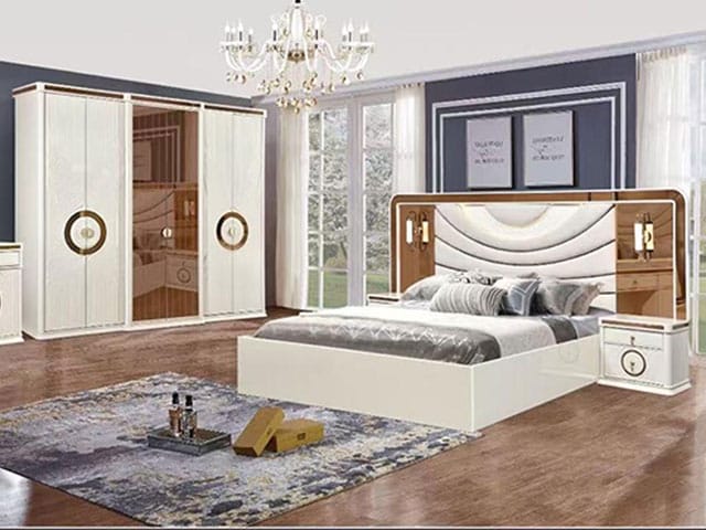 La chambre à coucher réf. 701 beige, gris et doré est conçue pour répondre aux besoins d’aménagement des espaces nuit modernes. L’association de teintes neutres et de finitions dorées apporte une ambiance douce et structurée, idéale pour une chambre à coucher fonctionnelle et agréable.