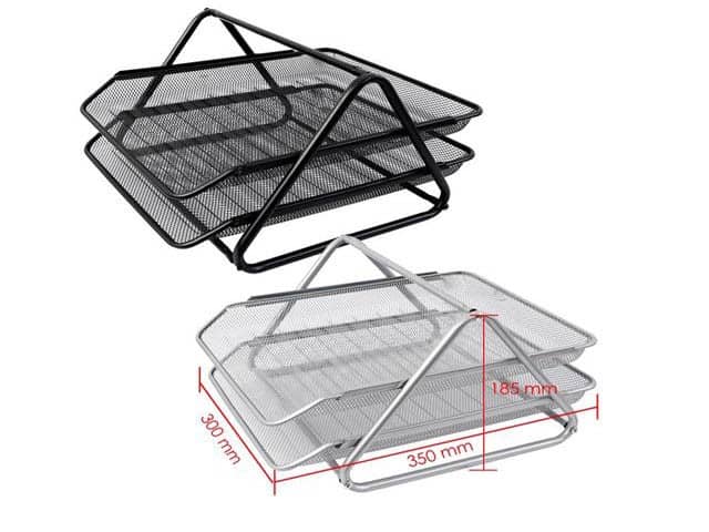 Corbeille à courrier HY62002 en métal gris, dotée de deux niveaux pratiques pour organiser facilement vos documents et dossiers A4. Robuste, élégante et peu encombrante, elle optimise votre espace de travail avec efficacité.