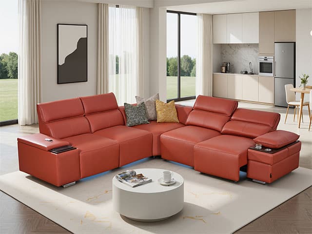 Le salon cuir 5 places angle HY-8131 couleur #9021 orange est pensé pour aménager efficacement votre espace tout en apportant une touche contemporaine. Grâce à sa configuration en angle, il optimise l’aménagement du salon et favorise la convivialité.