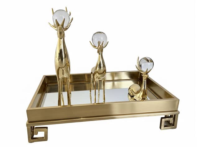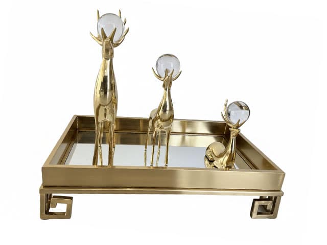 L’ensemble repose sur un plateau de présentation luxueux, conçu pour magnifier les figurines. Sa structure rectangulaire est réalisée en métal doré à finition brossée, avec des bordures hautes qui encadrent la scène comme un écrin. Le fond miroir du plateau démultiplie visuellement les formes par effet de réflexion, accentuant la luminosité et la richesse de l’ensemble.