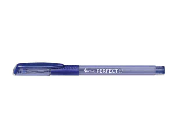 Stylo gel “Perfect” bleu, pointe fine de 0,5 mm, grip ergonomique en caoutchouc — écriture fluide et confortable.