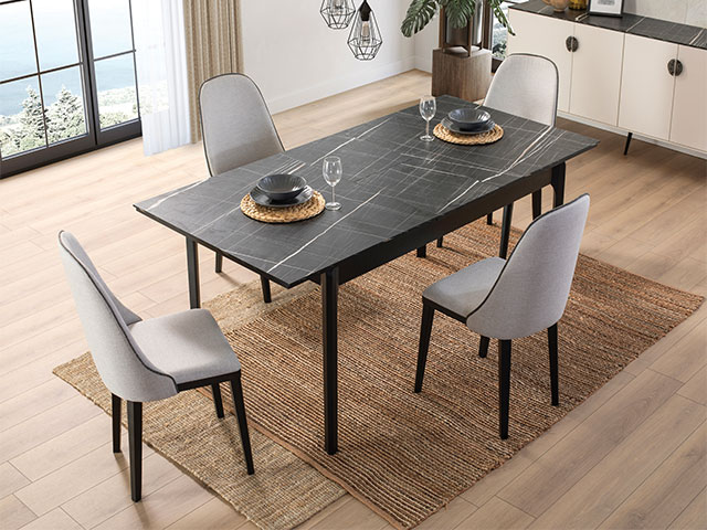 La couleur noire apporte une touche moderne et s’intègre facilement dans différents styles d’intérieur : contemporain, industriel ou minimaliste. Elle peut être associée à des chaises en bois, métal ou tissu pour créer un espace repas cohérent et personnalisé.