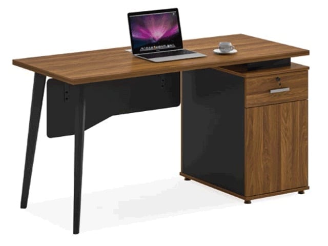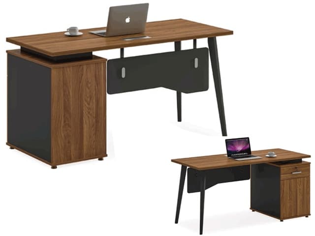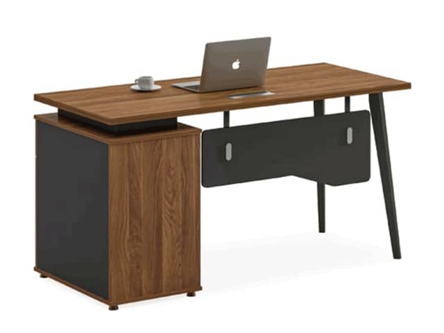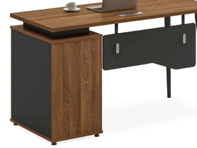 Le bureau est équipé d’un caisson de rangement mobile comprenant trois tiroirs spacieux, permettant d’organiser efficacement dossiers, fournitures et effets personnels. Ce caisson offre un gain de place appréciable tout en gardant les documents essentiels à portée de main. La surface de travail généreuse permet l’installation confortable d’un ordinateur, d’un écran, de documents et d’accessoires de bureau.