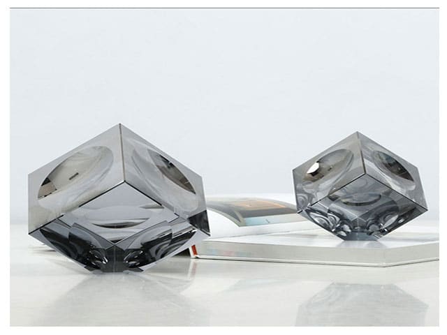 Chaque vase adopte une forme cubique travaillée avec précision. Les faces sont ornées d’évidements circulaires concaves, semblables à des lentilles optiques, creusées dans la masse. Ce travail du verre crée un jeu spectaculaire de reflets, de réfractions et de profondeur, donnant l’illusion d’un mouvement permanent selon l’angle de vue et la lumière ambiante.