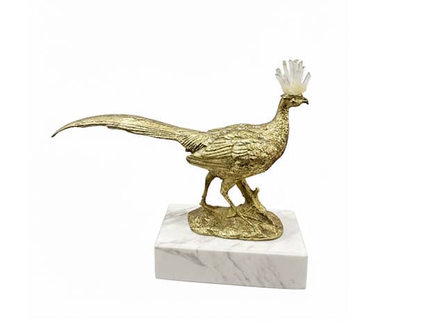 Chaque oiseau est réalisé en métal doré avec une texture travaillée imitant parfaitement les plumes, et surmonté d’une petite crête blanche délicate sur la tête. Leurs longues queues fines accentuent leur allure gracieuse et apportent un mouvement visuel élégant.